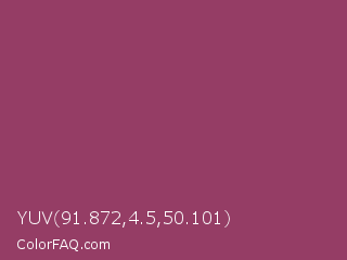 YUV 91.872,4.5,50.101 Color is a normal rose color and the nearest color is Vin Rouge #983d61. Hex code #953d65 and RGB value is rgb(149,61,101). In RGB color space, this color is composed of 58% red, 24% green, 40% blue, In CMYK color space, this color is composed of 0% cyan, 59% magenta, 32% yellow , 42% black , In HSL color space, this color has a hue angle of 333° , 42% saturation and 41% lightness.