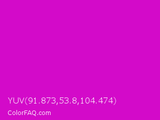 YUV 91.873,53.8,104.474 Color is a normal magenta color and the nearest color is Deep Magenta #cc00cc. Hex code #d30ac9 and RGB value is rgb(211,10,201). In RGB color space, this color is composed of 83% red, 4% green, 79% blue, In CMYK color space, this color is composed of 0% cyan, 95% magenta, 5% yellow , 17% black , In HSL color space, this color has a hue angle of 303° , 91% saturation and 43% lightness.