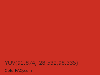 YUV 91.874,-28.532,98.335 Color is a normal red color and the nearest color is Fire Engine Red #ce2029. Hex code #cc2e22 and RGB value is rgb(204,46,34). In RGB color space, this color is composed of 80% red, 18% green, 13% blue, In CMYK color space, this color is composed of 0% cyan, 77% magenta, 83% yellow , 20% black , In HSL color space, this color has a hue angle of 4° , 71% saturation and 47% lightness.