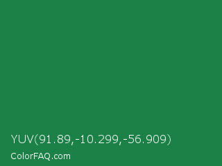 YUV 91.89,-10.299,-56.909 Color is a normal green color and the nearest color is Dark Spring Green #177245. Hex code #1b8147 and RGB value is rgb(27,129,71). In RGB color space, this color is composed of 11% red, 51% green, 28% blue, In CMYK color space, this color is composed of 79% cyan, 0% magenta, 45% yellow , 49% black , In HSL color space, this color has a hue angle of 146° , 65% saturation and 31% lightness.