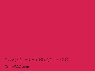 YUV 91.89,-5.862,107.09 Color is a normal rose color and the nearest color is Spanish Crimson #e51a4c. Hex code #d62050 and RGB value is rgb(214,32,80). In RGB color space, this color is composed of 84% red, 13% green, 31% blue, In CMYK color space, this color is composed of 0% cyan, 85% magenta, 63% yellow , 16% black , In HSL color space, this color has a hue angle of 344° , 74% saturation and 48% lightness.