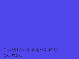 YUV 91.8,70.598,-10.349 Color is a normal indigo color and the nearest color is Majorelle Blue #6050dc. Hex code #5046eb and RGB value is rgb(80,70,235). In RGB color space, this color is composed of 31% red, 27% green, 92% blue, In CMYK color space, this color is composed of 66% cyan, 70% magenta, 0% yellow , 8% black , In HSL color space, this color has a hue angle of 244° , 80% saturation and 60% lightness.