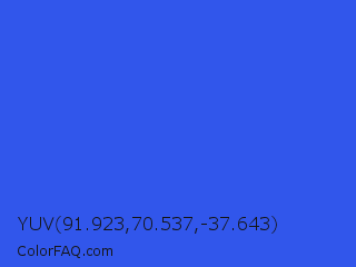 YUV 91.923,70.537,-37.643 Color is a normal blue color and the nearest color is Ultramarine Blue #4166f5. Hex code #3156eb and RGB value is rgb(49,86,235). In RGB color space, this color is composed of 19% red, 34% green, 92% blue, In CMYK color space, this color is composed of 79% cyan, 63% magenta, 0% yellow , 8% black , In HSL color space, this color has a hue angle of 228° , 82% saturation and 56% lightness.