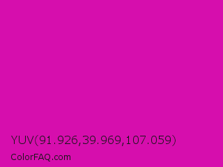 YUV 91.926,39.969,107.059 Color is a normal magenta color and the nearest color is Hollywood Cerise #f400a1. Hex code #d60ead and RGB value is rgb(214,14,173). In RGB color space, this color is composed of 84% red, 5% green, 68% blue, In CMYK color space, this color is composed of 0% cyan, 93% magenta, 19% yellow , 16% black , In HSL color space, this color has a hue angle of 312° , 88% saturation and 45% lightness.