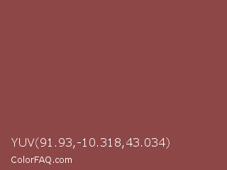 YUV 91.93,-10.318,43.034 Color is a normal red color and the nearest color is Copper Rust #944747. Hex code #8d4747 and RGB value is rgb(141,71,71). In RGB color space, this color is composed of 55% red, 28% green, 28% blue, In CMYK color space, this color is composed of 0% cyan, 50% magenta, 50% yellow , 45% black , In HSL color space, this color has a hue angle of 0° , 33% saturation and 42% lightness.