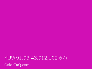 YUV 91.93,43.912,102.67 Color is a normal magenta color and the nearest color is Deep Magenta #cc00cc. Hex code #d10fb5 and RGB value is rgb(209,15,181). In RGB color space, this color is composed of 82% red, 6% green, 71% blue, In CMYK color space, this color is composed of 0% cyan, 93% magenta, 13% yellow , 18% black , In HSL color space, this color has a hue angle of 309° , 87% saturation and 44% lightness.