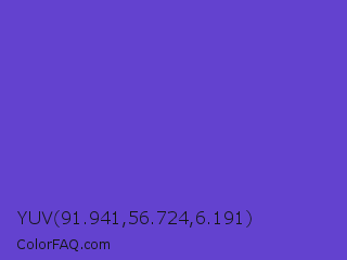 YUV 91.941,56.724,6.191 Color is a normal indigo color and the nearest color is Iris #5a4fcf. Hex code #6342cf and RGB value is rgb(99,66,207). In RGB color space, this color is composed of 39% red, 26% green, 81% blue, In CMYK color space, this color is composed of 52% cyan, 68% magenta, 0% yellow , 19% black , In HSL color space, this color has a hue angle of 254° , 59% saturation and 54% lightness.