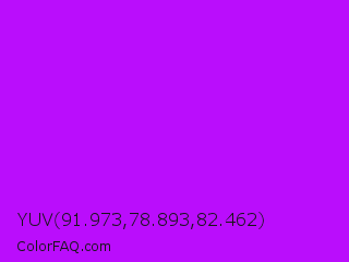 YUV 91.973,78.893,82.462 Color is a normal purple color and the nearest color is Electric Purple #bf00ff. Hex code #ba0dfc and RGB value is rgb(186,13,252). In RGB color space, this color is composed of 73% red, 5% green, 99% blue, In CMYK color space, this color is composed of 26% cyan, 95% magenta, 0% yellow , 1% black , In HSL color space, this color has a hue angle of 283° , 98% saturation and 52% lightness.