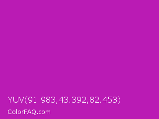YUV 91.983,43.392,82.453 Color is a normal magenta color and the nearest color is Byzantine #bd33a4. Hex code #ba1bb4 and RGB value is rgb(186,27,180). In RGB color space, this color is composed of 73% red, 11% green, 71% blue, In CMYK color space, this color is composed of 0% cyan, 85% magenta, 3% yellow , 27% black , In HSL color space, this color has a hue angle of 302° , 75% saturation and 42% lightness.