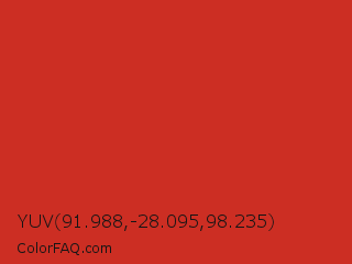 YUV 91.988,-28.095,98.235 Color is a normal red color and the nearest color is Fire Engine Red #ce2029. Hex code #cc2e23 and RGB value is rgb(204,46,35). In RGB color space, this color is composed of 80% red, 18% green, 14% blue, In CMYK color space, this color is composed of 0% cyan, 77% magenta, 83% yellow , 20% black , In HSL color space, this color has a hue angle of 4° , 71% saturation and 47% lightness.