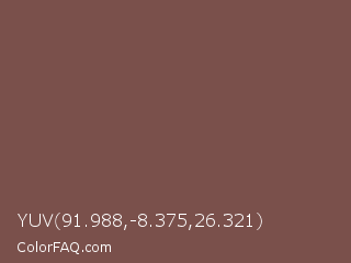 YUV 91.988,-8.375,26.321 Color is a normal red color and the nearest color is Tuscan Red #7c4848. Hex code #7a504b and RGB value is rgb(122,80,75). In RGB color space, this color is composed of 48% red, 31% green, 29% blue, In CMYK color space, this color is composed of 0% cyan, 34% magenta, 39% yellow , 52% black , In HSL color space, this color has a hue angle of 6° , 24% saturation and 39% lightness.