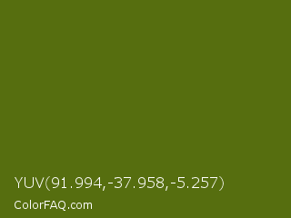 YUV 91.994,-37.958,-5.257 Color is a dark lime color and the nearest color is Saratoga #555b10. Hex code #566e0f and RGB value is rgb(86,110,15). In RGB color space, this color is composed of 34% red, 43% green, 6% blue, In CMYK color space, this color is composed of 22% cyan, 0% magenta, 86% yellow , 57% black , In HSL color space, this color has a hue angle of 75° , 76% saturation and 25% lightness.