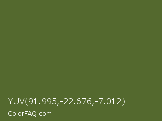 YUV 91.995,-22.676,-7.012 Color is a dark green color and the nearest color is Dark Olive Green #556b2f. Hex code #54692e and RGB value is rgb(84,105,46). In RGB color space, this color is composed of 33% red, 41% green, 18% blue, In CMYK color space, this color is composed of 20% cyan, 0% magenta, 56% yellow , 59% black , In HSL color space, this color has a hue angle of 81° , 39% saturation and 30% lightness.