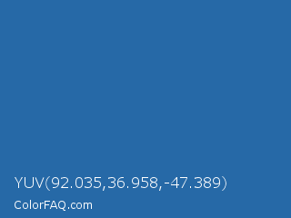 YUV 92.035,36.958,-47.389 Color is a normal blue color and the nearest color is Lapis Lazuli #26619c. Hex code #2669a7 and RGB value is rgb(38,105,167). In RGB color space, this color is composed of 15% red, 41% green, 65% blue, In CMYK color space, this color is composed of 77% cyan, 37% magenta, 0% yellow , 35% black , In HSL color space, this color has a hue angle of 209° , 63% saturation and 40% lightness.