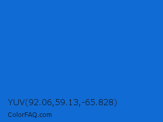 YUV 92.06,59.13,-65.828 Color is a normal blue color and the nearest color is Bright Navy Blue #1974d2. Hex code #116bd4 and RGB value is rgb(17,107,212). In RGB color space, this color is composed of 7% red, 42% green, 83% blue, In CMYK color space, this color is composed of 92% cyan, 50% magenta, 0% yellow , 17% black , In HSL color space, this color has a hue angle of 212° , 85% saturation and 45% lightness.
