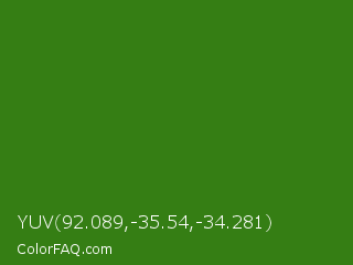 YUV 92.089,-35.54,-34.281 Color is a dark green color and the nearest color is Bilbao #327c14. Hex code #357e14 and RGB value is rgb(53,126,20). In RGB color space, this color is composed of 21% red, 49% green, 8% blue, In CMYK color space, this color is composed of 58% cyan, 0% magenta, 84% yellow , 51% black , In HSL color space, this color has a hue angle of 101° , 73% saturation and 29% lightness.