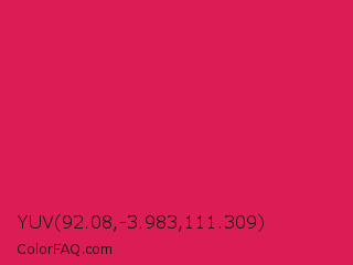 YUV 92.08,-3.983,111.309 Color is a normal rose color and the nearest color is Spanish Crimson #e51a4c. Hex code #db1d54 and RGB value is rgb(219,29,84). In RGB color space, this color is composed of 86% red, 11% green, 33% blue, In CMYK color space, this color is composed of 0% cyan, 87% magenta, 62% yellow , 14% black , In HSL color space, this color has a hue angle of 343° , 77% saturation and 49% lightness.