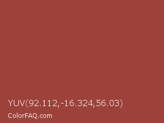 YUV 92.112,-16.324,56.03 Color is a normal red color and the nearest color is Chestnut #954535. Hex code #9c423b and RGB value is rgb(156,66,59). In RGB color space, this color is composed of 61% red, 26% green, 23% blue, In CMYK color space, this color is composed of 0% cyan, 58% magenta, 62% yellow , 39% black , In HSL color space, this color has a hue angle of 4° , 45% saturation and 42% lightness.