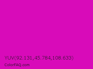 YUV 92.131,45.784,108.633 Color is a normal magenta color and the nearest color is Deep Magenta #cc00cc. Hex code #d80bb9 and RGB value is rgb(216,11,185). In RGB color space, this color is composed of 85% red, 4% green, 73% blue, In CMYK color space, this color is composed of 0% cyan, 95% magenta, 14% yellow , 15% black , In HSL color space, this color has a hue angle of 309° , 90% saturation and 45% lightness.