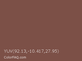 YUV 92.13,-10.417,27.95 Color is a normal red color and the nearest color is Tuscan Red #7c4848. Hex code #7c5047 and RGB value is rgb(124,80,71). In RGB color space, this color is composed of 49% red, 31% green, 28% blue, In CMYK color space, this color is composed of 0% cyan, 35% magenta, 43% yellow , 51% black , In HSL color space, this color has a hue angle of 10° , 27% saturation and 38% lightness.