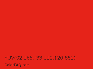 YUV 92.165,-33.112,120.881 Color is a normal red color and the nearest color is Lust #e62020. Hex code #e62319 and RGB value is rgb(230,35,25). In RGB color space, this color is composed of 90% red, 14% green, 10% blue, In CMYK color space, this color is composed of 0% cyan, 85% magenta, 89% yellow , 10% black , In HSL color space, this color has a hue angle of 3° , 80% saturation and 50% lightness.
