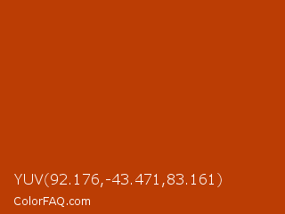 YUV 92.176,-43.471,83.161 Color is a normal orange color and the nearest color is Mahogany #c04000. Hex code #bb3d04 and RGB value is rgb(187,61,4). In RGB color space, this color is composed of 73% red, 24% green, 2% blue, In CMYK color space, this color is composed of 0% cyan, 67% magenta, 98% yellow , 27% black , In HSL color space, this color has a hue angle of 19° , 96% saturation and 37% lightness.
