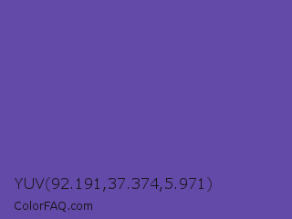 YUV 92.191,37.374,5.971 Color is a normal indigo color and the nearest color is Butterfly Bush #624e9a. Hex code #634aa8 and RGB value is rgb(99,74,168). In RGB color space, this color is composed of 39% red, 29% green, 66% blue, In CMYK color space, this color is composed of 41% cyan, 56% magenta, 0% yellow , 34% black , In HSL color space, this color has a hue angle of 256° , 39% saturation and 47% lightness.