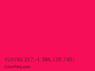 YUV 92.217,-1.586,135.745 Color is a normal rose color and the nearest color is Folly #ff004f. Hex code #f70e59 and RGB value is rgb(247,14,89). In RGB color space, this color is composed of 97% red, 5% green, 35% blue, In CMYK color space, this color is composed of 0% cyan, 94% magenta, 64% yellow , 3% black , In HSL color space, this color has a hue angle of 341° , 94% saturation and 51% lightness.