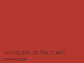 YUV 92.235,-22.794,77.847 Color is a normal red color and the nearest color is Well Read #b43332. Hex code #b5382e and RGB value is rgb(181,56,46). In RGB color space, this color is composed of 71% red, 22% green, 18% blue, In CMYK color space, this color is composed of 0% cyan, 69% magenta, 75% yellow , 29% black , In HSL color space, this color has a hue angle of 4° , 59% saturation and 45% lightness.
