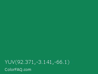 YUV 92.371,-3.141,-66.1 Color is a dark green color and the nearest color is Deep Green Cyan Turquoise #0e7c61. Hex code #118456 and RGB value is rgb(17,132,86). In RGB color space, this color is composed of 7% red, 52% green, 34% blue, In CMYK color space, this color is composed of 87% cyan, 0% magenta, 35% yellow , 48% black , In HSL color space, this color has a hue angle of 156° , 77% saturation and 29% lightness.