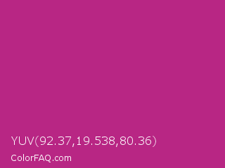 YUV 92.37,19.538,80.36 Color is a normal magenta color and the nearest color is Medium Red Violet #bb3385. Hex code #b82684 and RGB value is rgb(184,38,132). In RGB color space, this color is composed of 72% red, 15% green, 52% blue, In CMYK color space, this color is composed of 0% cyan, 79% magenta, 28% yellow , 28% black , In HSL color space, this color has a hue angle of 321° , 66% saturation and 44% lightness.