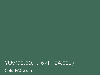 YUV 92.39,-1.671,-24.021 Color is a normal green color and the nearest color is Mineral Green #3f5d53. Hex code #416b59 and RGB value is rgb(65,107,89). In RGB color space, this color is composed of 25% red, 42% green, 35% blue, In CMYK color space, this color is composed of 39% cyan, 0% magenta, 17% yellow , 58% black , In HSL color space, this color has a hue angle of 154° , 24% saturation and 34% lightness.