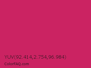 YUV 92.414,2.754,96.984 Color is a normal rose color and the nearest color is Rose Red #c21e56. Hex code #cb2362 and RGB value is rgb(203,35,98). In RGB color space, this color is composed of 80% red, 14% green, 38% blue, In CMYK color space, this color is composed of 0% cyan, 83% magenta, 52% yellow , 20% black , In HSL color space, this color has a hue angle of 338° , 71% saturation and 47% lightness.