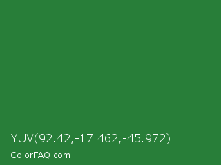 YUV 92.42,-17.462,-45.972 Color is a normal green color and the nearest color is Dark Spring Green #177245. Hex code #287e39 and RGB value is rgb(40,126,57). In RGB color space, this color is composed of 16% red, 49% green, 22% blue, In CMYK color space, this color is composed of 68% cyan, 0% magenta, 55% yellow , 51% black , In HSL color space, this color has a hue angle of 132° , 52% saturation and 33% lightness.