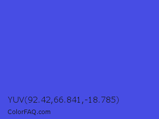 YUV 92.42,66.841,-18.785 Color is a normal blue color and the nearest color is Majorelle Blue #6050dc. Hex code #474de4 and RGB value is rgb(71,77,228). In RGB color space, this color is composed of 28% red, 30% green, 89% blue, In CMYK color space, this color is composed of 69% cyan, 66% magenta, 0% yellow , 11% black , In HSL color space, this color has a hue angle of 238° , 74% saturation and 59% lightness.
