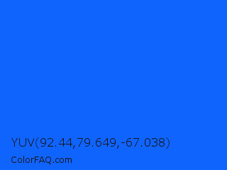 YUV 92.44,79.649,-67.038 Color is a normal blue color and the nearest color is Blue Ribbon #0066ff. Hex code #1064fe and RGB value is rgb(16,100,254). In RGB color space, this color is composed of 6% red, 39% green, 100% blue, In CMYK color space, this color is composed of 94% cyan, 61% magenta, 0% yellow , 0% black , In HSL color space, this color has a hue angle of 219° , 99% saturation and 53% lightness.