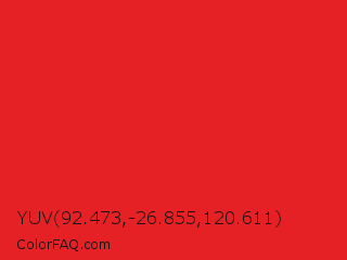 YUV 92.473,-26.855,120.611 Color is a normal red color and the nearest color is Lust #e62020. Hex code #e62126 and RGB value is rgb(230,33,38). In RGB color space, this color is composed of 90% red, 13% green, 15% blue, In CMYK color space, this color is composed of 0% cyan, 86% magenta, 83% yellow , 10% black , In HSL color space, this color has a hue angle of 358° , 80% saturation and 52% lightness.
