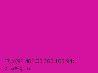 YUV 92.482,33.286,103.94 Color is a normal magenta color and the nearest color is Barbie Pink #e0218a. Hex code #d313a0 and RGB value is rgb(211,19,160). In RGB color space, this color is composed of 83% red, 7% green, 63% blue, In CMYK color space, this color is composed of 0% cyan, 91% magenta, 24% yellow , 17% black , In HSL color space, this color has a hue angle of 316° , 83% saturation and 45% lightness.