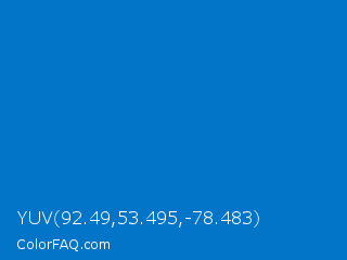 YUV 92.49,53.495,-78.483 Color is a normal blue color and the nearest color is True Blue #0073cf. Hex code #0375c9 and RGB value is rgb(3,117,201). In RGB color space, this color is composed of 1% red, 46% green, 79% blue, In CMYK color space, this color is composed of 99% cyan, 42% magenta, 0% yellow , 21% black , In HSL color space, this color has a hue angle of 205° , 97% saturation and 40% lightness.
