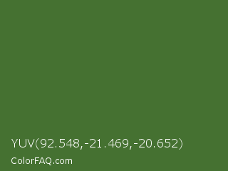 YUV 92.548,-21.469,-20.652 Color is a normal green color and the nearest color is Dark Olive Green #556b2f. Hex code #457131 and RGB value is rgb(69,113,49). In RGB color space, this color is composed of 27% red, 44% green, 19% blue, In CMYK color space, this color is composed of 39% cyan, 0% magenta, 57% yellow , 56% black , In HSL color space, this color has a hue angle of 101° , 40% saturation and 32% lightness.