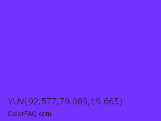 YUV 92.577,79.089,19.665 Color is a normal indigo color and the nearest color is Blue Violet #8a2be2. Hex code #7332fd and RGB value is rgb(115,50,253). In RGB color space, this color is composed of 45% red, 20% green, 99% blue, In CMYK color space, this color is composed of 55% cyan, 80% magenta, 0% yellow , 1% black , In HSL color space, this color has a hue angle of 259° , 98% saturation and 59% lightness.