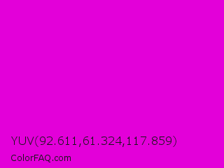 YUV 92.611,61.324,117.859 Color is a normal magenta color and the nearest color is Deep Magenta #cc00cc. Hex code #e300d9 and RGB value is rgb(227,-0,217). In RGB color space, this color is composed of 89% red, 0% green, 85% blue, In CMYK color space, this color is composed of 0% cyan, 100% magenta, 4% yellow , 11% black , In HSL color space, this color has a hue angle of 303° , 100% saturation and 45% lightness.