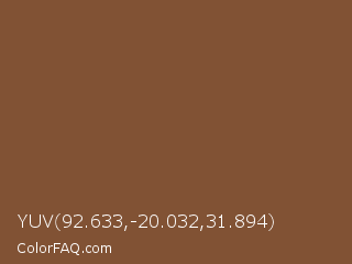 YUV 92.633,-20.032,31.894 Color is a normal orange color and the nearest color is Potters Clay #8c5738. Hex code #815234 and RGB value is rgb(129,82,52). In RGB color space, this color is composed of 51% red, 32% green, 20% blue, In CMYK color space, this color is composed of 0% cyan, 36% magenta, 60% yellow , 49% black , In HSL color space, this color has a hue angle of 23° , 43% saturation and 35% lightness.