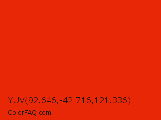 YUV 92.646,-42.716,121.336 Color is a normal red color and the nearest color is Ferrari Red #ff2800. Hex code #e72706 and RGB value is rgb(231,39,6). In RGB color space, this color is composed of 91% red, 15% green, 2% blue, In CMYK color space, this color is composed of 0% cyan, 83% magenta, 97% yellow , 9% black , In HSL color space, this color has a hue angle of 9° , 95% saturation and 46% lightness.