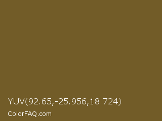 YUV 92.65,-25.956,18.724 Color is a dark orange color and the nearest color is Field Drab #6c541e. Hex code #725c28 and RGB value is rgb(114,92,40). In RGB color space, this color is composed of 45% red, 36% green, 16% blue, In CMYK color space, this color is composed of 0% cyan, 19% magenta, 65% yellow , 55% black , In HSL color space, this color has a hue angle of 42° , 48% saturation and 30% lightness.