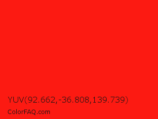 YUV 92.662,-36.808,139.739 Color is a normal red color and the nearest color is Red RYB #fe2712. Hex code #fc1a12 and RGB value is rgb(252,26,18). In RGB color space, this color is composed of 99% red, 10% green, 7% blue, In CMYK color space, this color is composed of 0% cyan, 90% magenta, 93% yellow , 1% black , In HSL color space, this color has a hue angle of 2° , 98% saturation and 53% lightness.