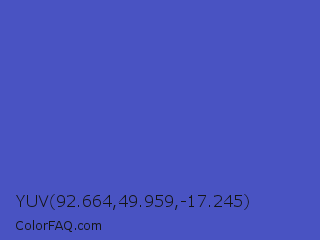 YUV 92.664,49.959,-17.245 Color is a normal blue color and the nearest color is Iris #5a4fcf. Hex code #4953c2 and RGB value is rgb(73,83,194). In RGB color space, this color is composed of 29% red, 33% green, 76% blue, In CMYK color space, this color is composed of 62% cyan, 57% magenta, 0% yellow , 24% black , In HSL color space, this color has a hue angle of 235° , 50% saturation and 52% lightness.