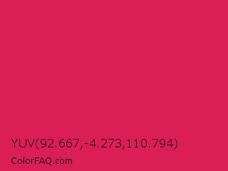YUV 92.667,-4.273,110.794 Color is a normal rose color and the nearest color is Spanish Crimson #e51a4c. Hex code #db1e54 and RGB value is rgb(219,30,84). In RGB color space, this color is composed of 86% red, 12% green, 33% blue, In CMYK color space, this color is composed of 0% cyan, 86% magenta, 62% yellow , 14% black , In HSL color space, this color has a hue angle of 343° , 76% saturation and 49% lightness.