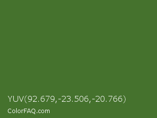 YUV 92.679,-23.506,-20.766 Color is a normal green color and the nearest color is Sap Green #507d2a. Hex code #45722d and RGB value is rgb(69,114,45). In RGB color space, this color is composed of 27% red, 45% green, 18% blue, In CMYK color space, this color is composed of 39% cyan, 0% magenta, 61% yellow , 55% black , In HSL color space, this color has a hue angle of 99° , 43% saturation and 31% lightness.
