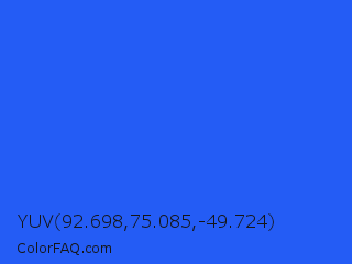 YUV 92.698,75.085,-49.724 Color is a normal blue color and the nearest color is Blue Crayola #1f75fe. Hex code #245cf5 and RGB value is rgb(36,92,245). In RGB color space, this color is composed of 14% red, 36% green, 96% blue, In CMYK color space, this color is composed of 85% cyan, 62% magenta, 0% yellow , 4% black , In HSL color space, this color has a hue angle of 224° , 91% saturation and 55% lightness.